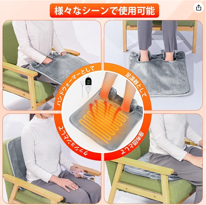 2. 電気ホットマットとして: カバーを外せば、クッションや座布団の上に敷く「ミニホットカーペット」としても代用可能。お尻や背中を温めるのにも重宝します。